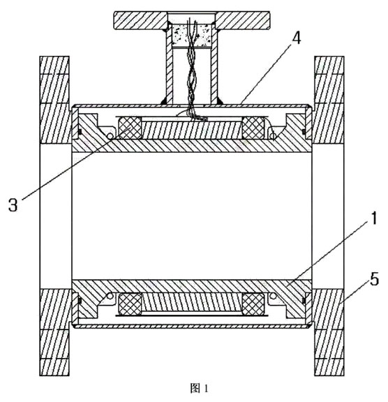 所述導流管1上固定有一全封閉的密封罩4,其兩端各設(shè)有一電磁配對法蘭5,其管壁上設(shè)有兩個貫通其管壁的測量孔,每個測量孔對應(yīng)一個測量電極2,每個測量電極2的一端插入其對應(yīng)測量孔中,每個測量電極2的外周面與對應(yīng)測量孔的孔壁之間均用絕緣隔套隔離并密封,各測量電極2及各勵磁線圈3均罩設(shè)在密封罩4內(nèi),并各經(jīng)導線引出密封罩4;其特征在于:所述導流管1是一塑膠絕緣管體。