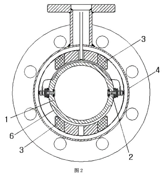 以下結(jié)合附圖說明對本發(fā)明的實施例作進一步詳細描述,但本實施例并不用于限制本發(fā)明,凡是采用本發(fā)明的相似結(jié)構(gòu)及其相似變化,均應(yīng)列入本發(fā)明的保護范圍。如圖1-圖2所示,本發(fā)明實施例所提供的一種電磁流量計的無樹里測量頭,包括導流管1、測量電極2和勵磁線圏3,所述測量電極2和勵磁線圈3各有兩個,沿導流管1的周向軸對稱交替固定在導流管管壁上;