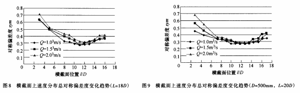 圖7以曲線的形式給出了不同橫截面速度分布總對(duì)稱偏差度的變化趨勢(shì)。從圖7可以看出,沿著直管流動(dòng)方向,總對(duì)稱偏差度先減小后增大,*小值在ι=lOD(Q=1.0m3/s)和11D(Q=1.5m3/s和2.0m3/s)位置處。這是由于在靠近上游彎管和下游彎管的直管,流動(dòng)受彎管的影響,且上游彎管對(duì)直管內(nèi)速度分布影響較大。ι=lOD位置的速度總對(duì)稱偏差度比ι=5D位置的降低了很多,流量Q=1.0、1.5和2.0m3/s3個(gè)工況下,速度總對(duì)稱偏差度分別減小了0.3065、0.1642/0.1907。由此可見,由于速度分布對(duì)稱度大幅度的提高,電磁流量計(jì)安裝在ι=lOD位置時(shí)流量計(jì)量的準(zhǔn)確度將大大高于電磁流量計(jì)安裝在ι=5D位置。