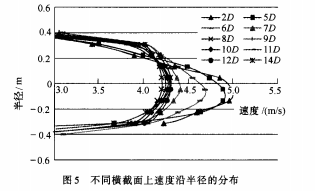 不同橫截面(ι=2D、5D、6D、……、14D)上速度沿著半徑的分布見圖5。從圖5可以看出,在ι≤7D的橫截面上,速度分布明顯不對(duì)稱,且隨著ι的增大,速度軸對(duì)稱情況逐漸好轉(zhuǎn);在其它橫截面上,速度分布趨于對(duì)稱。