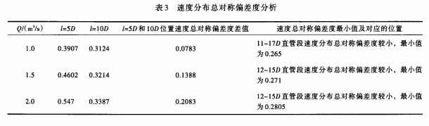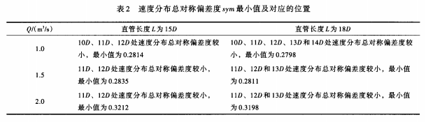 4.1.3 800mm內(nèi)徑電磁流量計(jì)測(cè)量管路設(shè)計(jì)分析 根據(jù)上述計(jì)算結(jié)果統(tǒng)計(jì)出不同過流量、不同直管長(zhǎng)度,速度分布總對(duì)稱偏差度的*小值及對(duì)應(yīng)的位置,見表2。從表2可以看出,當(dāng)直管長(zhǎng)度L取12m和14.4m時(shí),均有部分位置的速度分布總對(duì)稱偏差度較小,且兩種直管長(zhǎng)度下總對(duì)稱偏差度*小值相差很小。以Q=2.0m3/s為例,L取12m和14.4m時(shí),總對(duì)稱偏差度*小值分別為0.3212和0.3198,差值為,0.0014。由此可見,當(dāng)測(cè)量直管長(zhǎng)度達(dá)到一定值時(shí),繼續(xù)延長(zhǎng)測(cè)量直管長(zhǎng)度并不能顯著改善管內(nèi)速度的軸對(duì)稱分布情況。