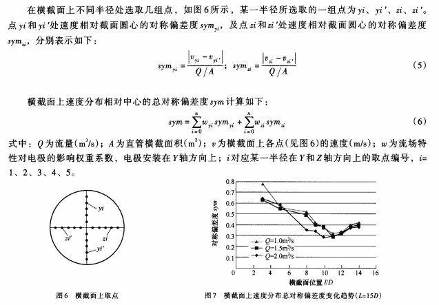 根據(jù)計(jì)算結(jié)果分析,盡管直管上并沒有速度完全中心軸對(duì)稱(速度總對(duì)稱偏差度為0)的用于安裝電磁流量計(jì)的理想位置,但是由于sym*小值較小,且延長(zhǎng)直管長(zhǎng)度后sym*小值變化很小,因此可以認(rèn)為,在設(shè)計(jì)800mm內(nèi)徑電磁流量計(jì)測(cè)量管路時(shí),直管長(zhǎng)度取12m可滿足電磁流量計(jì)的安裝和測(cè)量要求,但考慮到電磁流量計(jì)本身的長(zhǎng)度,直管長(zhǎng)度應(yīng)在12m的基礎(chǔ)上適當(dāng)加長(zhǎng)。