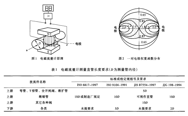 盡管電磁流量計(jì)生產(chǎn)廠家不斷追求流量計(jì)本身的精度,電磁流量計(jì)的設(shè)計(jì)和工藝技術(shù)在不斷提高,但實(shí)際測(cè)量中,工藝管道中的彎管、閥門等都會(huì)引起流動(dòng)畸變、二次流或漩渦,水流只有經(jīng)過相當(dāng)長(zhǎng)的直管,管內(nèi)流速才能呈中心軸對(duì)稱分布。對(duì)電磁流量計(jì)上、下游直管長(zhǎng)度的要求是保證流速呈中心軸對(duì)稱分布,獲得儀表測(cè)量精確度的必要條件之一。各標(biāo)準(zhǔn)或檢定規(guī)程提出了電磁流量計(jì)所要求的上、下游直管長(zhǎng)度,如表1所示,要求比通常要求高,這是為了保證達(dá)到0.5級(jí)精度儀表的要求。ISO6817—1997是電磁流量計(jì)應(yīng)用標(biāo)準(zhǔn),該標(biāo)準(zhǔn)規(guī)定,對(duì)任何類型的擾流件,電磁流量計(jì)上游至少應(yīng)有10D(測(cè)量管內(nèi)徑)長(zhǎng)度的直管,性能變動(dòng)才能保證不超過1%。ISO9104—1991是電磁流量計(jì)性能評(píng)定標(biāo)準(zhǔn),JJG198—1994是我國(guó)速度流量?jī)x表通用檢定規(guī)程,雖然也適用于電磁流量計(jì),但較簡(jiǎn)單,而ISO9104—1991比較詳細(xì)。