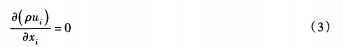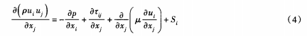 式中:p為流體密度;u為速度;P為壓力;r為雷諾應(yīng)力;x為空間坐標(biāo);μ為動(dòng)力黏度;S為源項(xiàng),指標(biāo)i、j表示坐標(biāo)軸方向分量,遵從張量中的求和約定。