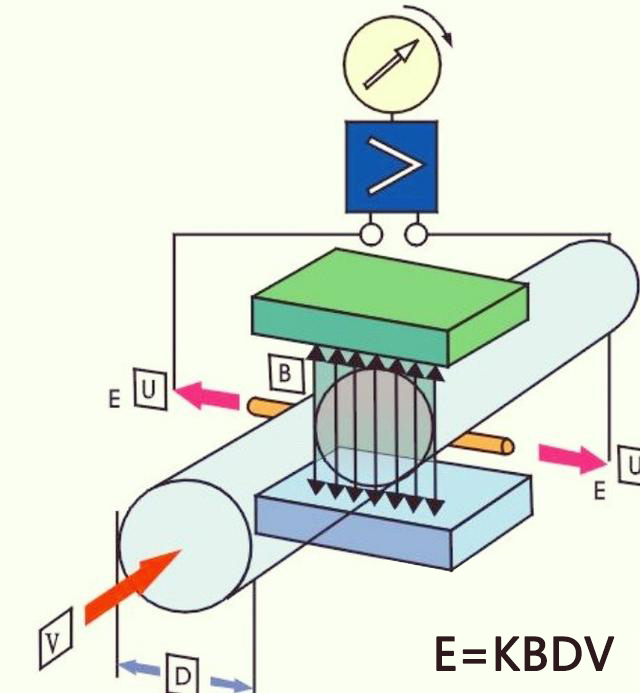 這是電磁流量計(jì)工作原理圖,具有一定的導(dǎo)電流體介質(zhì)且導(dǎo)電率*低不能低于0.3uS/cm,流經(jīng)激磁線圈產(chǎn)生的方波磁場(chǎng)且做切割磁感線運(yùn)動(dòng),并在左右電極上產(chǎn)生感應(yīng)電壓,然后變送器將感應(yīng)電壓轉(zhuǎn)換成4-20mA標(biāo)準(zhǔn)電流信號(hào)輸出。