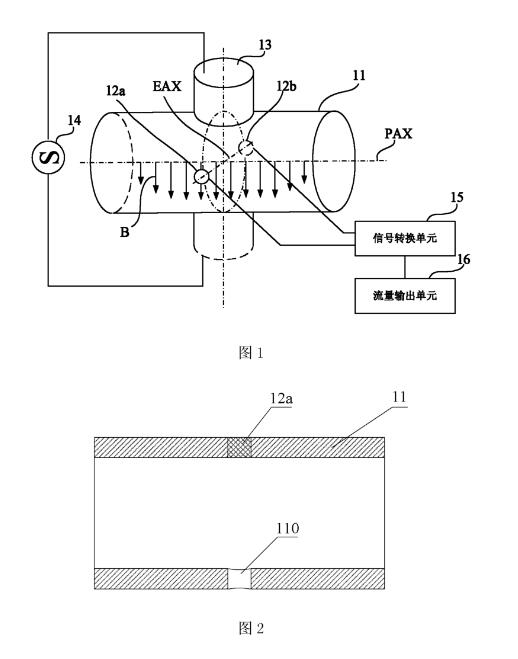 圖1顯示了現(xiàn)有技術(shù)中的一種電磁流量計(jì)的結(jié)構(gòu)。如圖1所示,所述電磁流量計(jì)包括:流動(dòng)有被測(cè)流體的測(cè)量管11,和與被測(cè)流體相接觸且對(duì)向配置在測(cè)量管11上的電極12a、12b,向被測(cè)流體施加磁場(chǎng)的勵(lì)磁線圈13,向勵(lì)磁線圈13供給勵(lì)磁電流、使其產(chǎn)生磁場(chǎng)的電源單元14。另外,所述電磁流量計(jì)還包括:與電極12a、12b連接用于檢測(cè)電極12a、l2b之間的感應(yīng)電動(dòng)勢(shì)的信號(hào)轉(zhuǎn)換單元15,從由信號(hào)轉(zhuǎn)換單元15檢測(cè)出的電極間電動(dòng)勢(shì)計(jì)算出被測(cè)流體的流量的流量輸出單元16應(yīng)用所述電磁流量計(jì),當(dāng)流體在測(cè)量管11中穿過由勵(lì)磁線圈13產(chǎn)生的磁場(chǎng)流動(dòng)時(shí),根據(jù)法拉第定律,就會(huì)在電極12a、12b上產(chǎn)生感應(yīng)電動(dòng)勢(shì),流體的平均流速與電極處感應(yīng)出的電壓之間具有線性關(guān)系,這一關(guān)系可以用下述公式表示:E=K*B*舉V,其中E為所產(chǎn)生的感應(yīng)電壓,K為比例常數(shù),B為磁場(chǎng)強(qiáng)度,D為導(dǎo)管直徑,而V為傳導(dǎo)型流體的平均流速這樣,利用信號(hào)轉(zhuǎn)換單元15和流量輸出單元16,即可測(cè)得與所述感應(yīng)電動(dòng)勢(shì)對(duì)應(yīng)的流體的流速,進(jìn)而獲得流體的流量陶瓷管電磁流量計(jì)傳感器有很多優(yōu)點(diǎn),但電極密封是一個(gè)很大難題。圖2為圖1中沿著與勵(lì)磁線圈13產(chǎn)生的磁場(chǎng)相垂直的平面用以顯示電極布置的剖示圖。如圖2,測(cè)量管11設(shè)有電極插孔110,所述電極插孔110為圓柱形或圓錐形,其厚度大致與測(cè)量管11的壁厚相當(dāng),電極(在這里僅標(biāo)示出電極12a)內(nèi)嵌于測(cè)量管11的電極插孔110中。然而,圖2所示中的電極,只有少數(shù)廠家具備特殊的燒結(jié)技術(shù),在高溫高壓環(huán)境下制作出電極以確保電極不滲漏,實(shí)現(xiàn)難度極大。而采用0型圈等機(jī)械裝配密封,由于陶瓷材料表面一定厚度會(huì)變湖,使用時(shí)間一長(zhǎng),絕緣性就會(huì)下降,影響測(cè)量精度