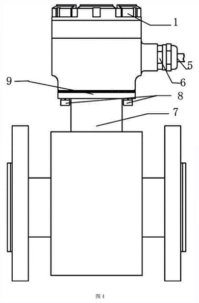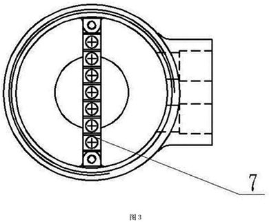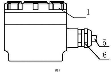 本實施例如圖4所示,分體接線盒用4只M6的螺釘8將殼體3與固定在流量傳感器7上端,殼體3與傳感器7之間采用橡膠密封墊9密封。端子排7用兩個M4的螺釘固定在殼體內(nèi),接線端子通過連接電纜5,穿過安裝在殼體上的格蘭頭6連接到變送器。分體蓋l通過螺紋擰緊在殼體3的上端,分體蓋1與殼體3的密封采用O型圈密封。使用時電纜與管道軸線方向一致,管道為垂直方向時,電纜出線方向朝下,從而不會造成外部的液體流