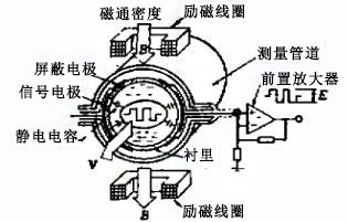 無電極式電磁流量計原理如圖所示。當導(dǎo)電性液流過與流動方向垂直的磁場(測量管道)時,根據(jù)法拉第電磁感應(yīng)定律,就會產(chǎn)生與平均流速成正比的感應(yīng)電動勢E。這一電動勢用一對信號電極檢測,該電極放置在(不接觸流體,稱無電極)與流動方向及磁場方向垂直的測量管村里外壁上測得們流量信號經(jīng)轉(zhuǎn)換放大后,即作為流體的體積流量這個電動勢用下式表示,即與平均流速成正比: