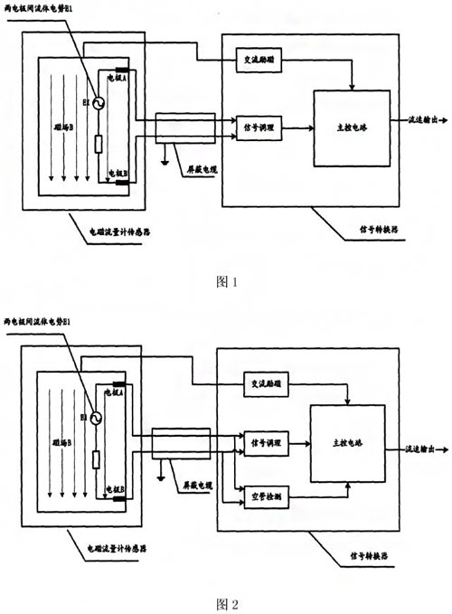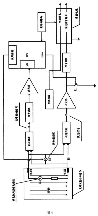 圖1是一種原有電磁流量計(jì)的電路結(jié)構(gòu)示意圖圖2是一種原有帶空管檢測(cè)的電磁流量計(jì)的電路結(jié)構(gòu)示意圖圖3是一個(gè)電極與地之間施加空管檢測(cè)信號(hào)的電磁流量計(jì)的電路結(jié)構(gòu)示意圖圖4是兩個(gè)電極之間施加空管檢測(cè)信號(hào)的電磁流量計(jì)的電路結(jié)構(gòu)示意圖五、具體實(shí)施方式見圖1示意圖中,電磁流量計(jì)傳感器在交流勵(lì)磁下,產(chǎn)生交變磁場(chǎng),導(dǎo)電流體在交變磁場(chǎng)中切割磁力線產(chǎn)生感應(yīng)電勢(shì)E1,通過(guò)屏蔽電纜輸出至遠(yuǎn)端信號(hào)轉(zhuǎn)換器的主控制電路板,在主控制電路板上輸出流速信號(hào)并顯示見圖3、圖A示意圖中,由CPU控制口產(chǎn)生周期為16us的高頻激勵(lì),經(jīng)模擬轉(zhuǎn)換為高頻正弦激勵(lì)E2,該i正弦激勵(lì)直接施加在,電磁流量計(jì)傳感器的其中一個(gè)電極與地或者是兩個(gè)電極之間,(圖3是一個(gè)電極與地之間施加空管檢測(cè)信號(hào)的電磁流量計(jì)的電路結(jié)構(gòu)圖,圖4是兩個(gè)電極之間施加空管檢測(cè)信號(hào)的電磁流量計(jì)的電路結(jié)構(gòu)圖):由此產(chǎn)生被測(cè)流體內(nèi)阻R1的測(cè)量信號(hào)U1,該測(cè)量信號(hào)U1與流體內(nèi)阻R1成線性關(guān)系U1=K*R1(K為已知系數(shù)),不可避免的是流體內(nèi)阻測(cè)量信號(hào)與流體流速測(cè)量信號(hào)同時(shí)存在,二者混在一起,再經(jīng)過(guò)高通濾波電路將空管檢測(cè)信號(hào)提取出來(lái),此時(shí)對(duì)流速信號(hào)衰減在604B以上,經(jīng)CP實(shí)時(shí)采樣并經(jīng)過(guò)數(shù)字濾波后,與設(shè)定的閱值(可調(diào)參數(shù))相比較,若判斷為空管,則v發(fā)出zcro信號(hào),立刻閉合開關(guān)K1關(guān)閉流速測(cè)量信號(hào),使信號(hào)轉(zhuǎn)換器顯示為零,否則斷開開關(guān)K正常輸出流速信號(hào)。而電極上流速測(cè)量信號(hào)經(jīng)過(guò)低通濾波電路,此時(shí)對(duì)空管檢測(cè)信號(hào)衰減60u8以上,再經(jīng)過(guò)信號(hào)調(diào)理電路后輸出流速信號(hào),實(shí)現(xiàn)與空管檢測(cè)信號(hào)相互分離,從而保證流速測(cè)量的準(zhǔn)確度008]見圖2示意圖中,是一種原有的帶空管檢測(cè)的電磁流量計(jì)的電路結(jié)構(gòu)圖,由于電纜分布電容的影響,該分布電容對(duì)高頻率的空管檢測(cè)信號(hào)有一定的損耗,特別是長(zhǎng)距離的屏蔽電纜,會(huì)直接影響到空管檢測(cè)信號(hào)對(duì)于流體電導(dǎo)率的測(cè)試,所以該結(jié)構(gòu)并不適合,本實(shí)用新型提出的高頻率信號(hào)空管檢測(cè)方式。結(jié)合圖3和圖4可以看出為了保證微弱的空管檢測(cè)信號(hào)不失真的傳輸,空管檢測(cè)裝置就近放置于傳感器出線處(傳感器內(nèi)部),進(jìn)行信號(hào)處理后再通過(guò)屏蔽電纜傳輸,從而解決了高頻率空管檢測(cè)信號(hào)對(duì)電纜分布電容大小的要求009由于電磁流量計(jì)傳感器與信號(hào)傳換器之間通常只有用于傳輸流速信號(hào)的二芯屏數(shù)電纜,并沒有低壓直流電源供給電纜,為了滿足通用的安裝習(xí)慣,不對(duì)空管檢測(cè)裝置另外增加供電電纜,空管檢測(cè)裝置的供電電源使用二芯屏蔽電纜的其中一根導(dǎo)線進(jìn)行供電,另外一根導(dǎo)線用于傳輸經(jīng)過(guò)調(diào)理后的流速信號(hào);實(shí)現(xiàn)直流供電與信號(hào)傳輸共用一根二芯屏蔽電纜0020根據(jù)不同的使用環(huán)境,信號(hào)傳換器需要調(diào)整空管檢測(cè)裝置的空管閱值參數(shù)設(shè)置時(shí),則使用數(shù)字信號(hào)調(diào)制方式,該信號(hào)疊加在供電電源的電纜上進(jìn)行傳輸,方便在現(xiàn)場(chǎng)調(diào)整空管檢測(cè)裝置的參數(shù),滿足不同的使用條件。由于數(shù)字編解碼是已知的技術(shù),所以在這里不詳細(xì)進(jìn)行說(shuō)明