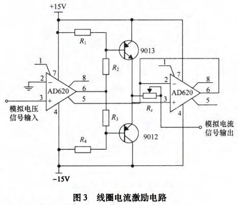 感應電壓檢測模塊主要由勵磁電路和弧狀電極傳感器組成,其中勵磁電路用來在流體測量區(qū)域產(chǎn)生盡量均勻的磁場分布,而內(nèi)嵌在管道內(nèi)壁與流體接觸的弧狀電極傳感器則負責拾取帶有流體速度參數(shù)的感應電壓信號。為在流體測量區(qū)域產(chǎn)生盡可能均勻的磁場,勵磁線圈采用馬鞍形線圈。在勵磁系統(tǒng)設計中,鐵芯可以提供磁通路徑,從而改變磁場分布,并加強磁感應強度。同時,為降低鐵芯渦流損耗以及增加磁路導磁系數(shù),鐵芯采用表面涂有絕緣漆的薄硅鋼片疊加而成。在鐵芯上套上馬鞍形線圈即組成勵磁系統(tǒng)。直流勵磁使得弧狀電極拾取的感應電壓中存在極化電壓信號,而交流勵磁則會引起的正交干擾和同相干擾。因此,為克服直流勵磁和交流勵磁存在的缺點,設計采用在線圈中施加頻率∫=6.25Hz的低頻矩形波勵磁方式。勵磁電路主要包括AD620和AD71組成的壓控電流源電路和三極管9013和9012組成的互補對稱推挽型功率放大電路,如圖3所示,模擬電壓信號由PXI模塊的模擬信號輸出端給出。