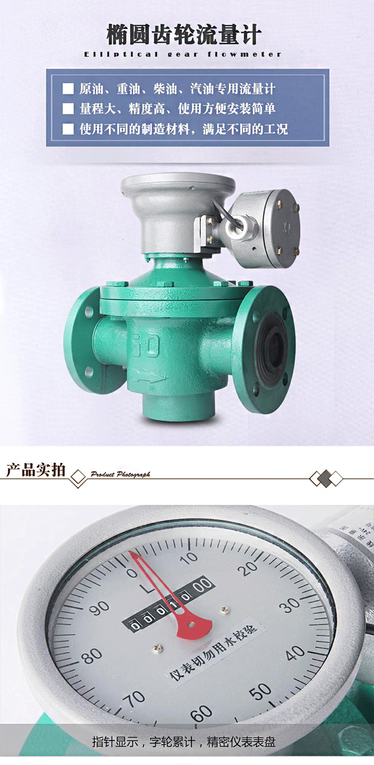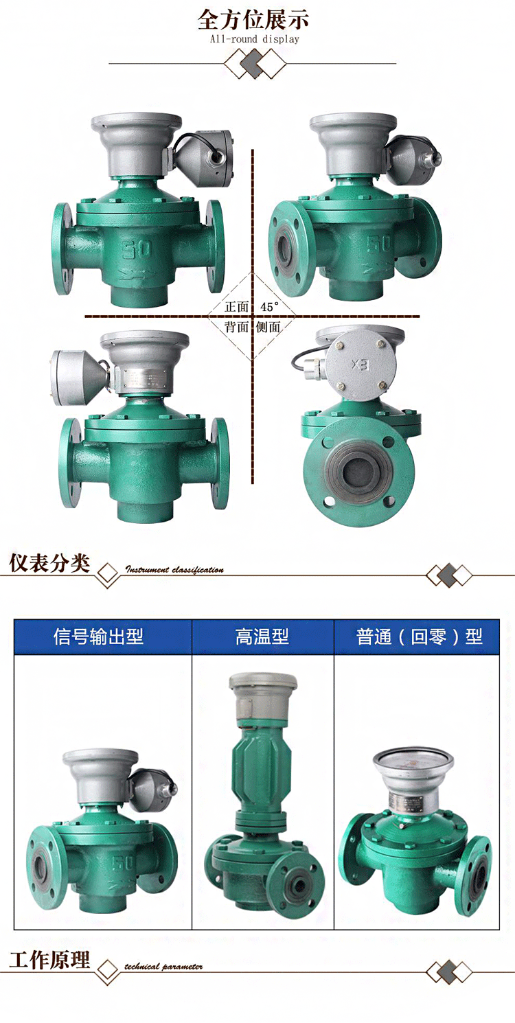 3、計(jì)量精度高,適用于高粘度介質(zhì)流量的測(cè)量,但不適用于含有固體顆粒的流體(固體顆粒會(huì)將齒輪卡死,以致無(wú)法測(cè)量流量)。如果被測(cè)液體介質(zhì)中夾雜有氣體時(shí),也會(huì)引起測(cè)量誤差。