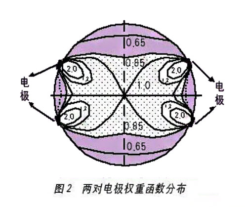 傳統(tǒng)點(diǎn)電極電磁流量計(jì)的權(quán)重函數(shù)分布如圖1所示,所繪等權(quán)重函數(shù)線(xiàn)近電極W=2,遠(yuǎn)離電極w=0.65。
