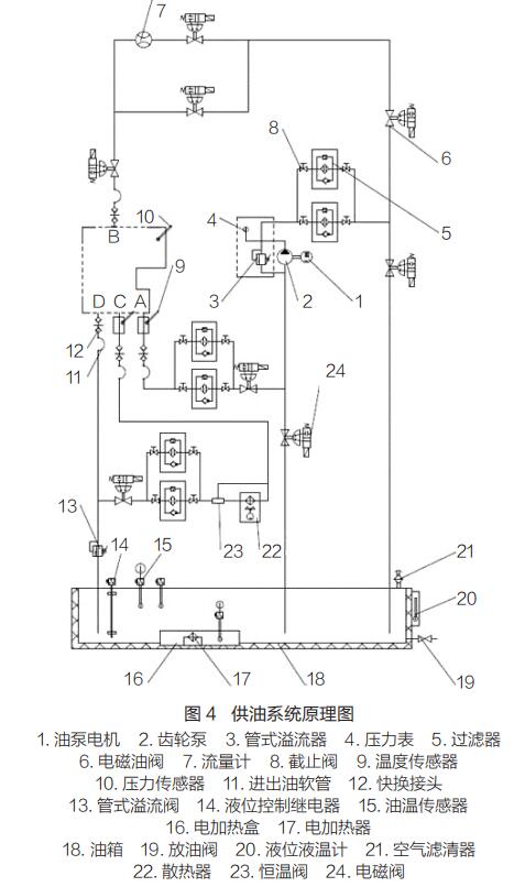 試驗臺供油系統(tǒng)用于提供變速器試驗所需的油壓和流量,保證油溫處于變速器的正常工作范圍內(nèi)。供油系統(tǒng)原理如圖 4 所示。通過計算機控制系統(tǒng)控制,可實現(xiàn)變速器試驗全過程油液循環(huán)過濾、保溫、濾清器堵塞報警等功能。
