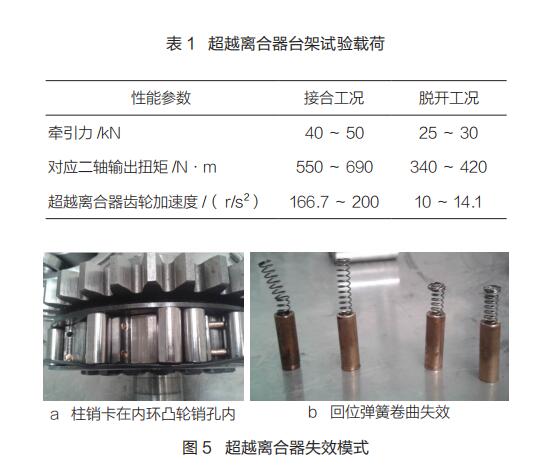 在試驗臺上模擬渦街流量計常見工況的傳動系載荷譜,臺架試驗 1h 等效于整機試驗 1.8h。利用試驗臺進行了 4 次累計600h 的試驗,超越離合器失效模式如圖 5 所示。超越離合器失效主要表現(xiàn)為柱銷卡死在內(nèi)環(huán)凸輪銷孔中,彈簧卷曲、斷裂,以及內(nèi)環(huán)凸輪滾道壓痕明顯,與市場反饋的失效模式基本一致。該試驗臺對市場故障具有很好的再現(xiàn)性,極大縮短了故障驗證時間,減少了整機試驗時的排放和噪聲污染,具有良好的經(jīng)濟效益和社會效益?!?/span>