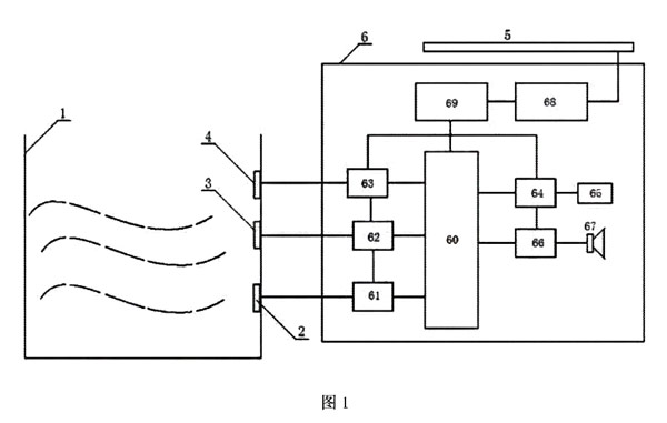 參照?qǐng)D1,一種鉆井泥漿儲(chǔ)罐液位報(bào)警裝置,包括泥漿儲(chǔ)罐1、傳感器2-4、報(bào)警器6和太陽(yáng)能電池5,所述泥漿儲(chǔ)罐1一側(cè)的內(nèi)壁上,自下而上順次設(shè)有第 一傳感器2、第 二傳感器3和第 三傳感器4,所述報(bào)警器6包括蓄電池68、穩(wěn)壓電路69、中央處理器60、第 一轉(zhuǎn)換電路61、第 二轉(zhuǎn)換電路62、第 三轉(zhuǎn)換電路63、隔離電路64、網(wǎng)絡(luò)接口65、放大電路66和喇叭67;所述第 一傳感器2通過(guò)第 一轉(zhuǎn)換電路61與中央處理器60的第 一輸入端相連接,第傳感器3通過(guò)第 二轉(zhuǎn)換電路62與中央處理器60的第 二輸入端相連接,第 三傳感器4通過(guò)第 三轉(zhuǎn)換電路63與中央處理器60的第 三輸入端相連接,中央處理器60的一輸出端通過(guò)隔離電路64與網(wǎng)絡(luò)接口65相連接,中央處理器60的另一輸出端通過(guò)放大電路66與喇叭67相連接,所述太陽(yáng)能電池5與蓄電池68相連接,蓄電池68通過(guò)穩(wěn)壓電路69與中央處理器60、第 一轉(zhuǎn)換電路61、第 二轉(zhuǎn)換電路62、第 三轉(zhuǎn)換電路63、隔離電路64及放大電路65相連接。其中,所述第 一傳感器2、第 二傳感器3及第 三傳感器4均為壓電陶瓷片。所述中央處理器60為單片機(jī)電路或可編程控制器。